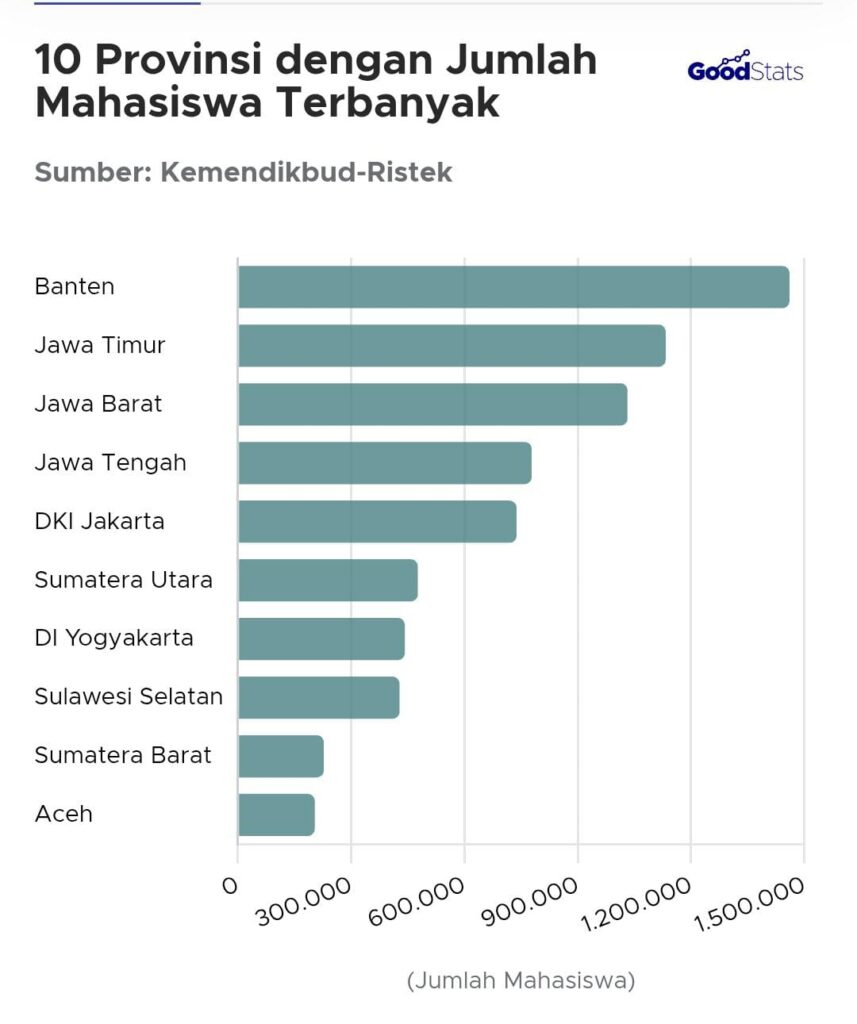 Ternyata, berdasarkan informasi dari Pangkalan Data Pendidikan Tinggi (PDDikti) Kemendikbudristek, menempatkan Provinsi Banten sebagai daerah dengan populasi mahasiswa terbanyak di Indonesia pada tahun 2022, dengan jumlah total 1,46 juta jiwa.