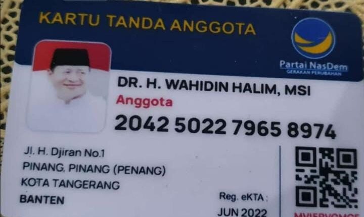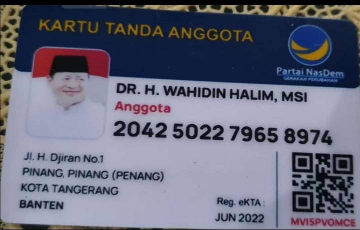 Kali ini, bukti bergabungnya pria yang akrab disapa WH itu sudah jelas dengan terbitnya Kartu Tanda Anggota (KTA) Partai NasDem atas nama DR. H. Wahidin Halim, MS.i dan beredar di media sosial baru-baru ini.