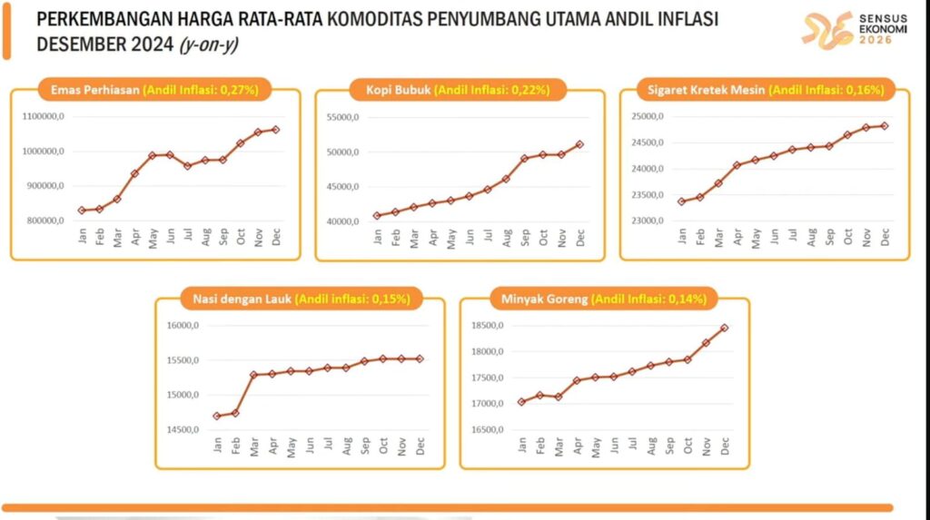 “Contohnya emas perhiasan dari Januari sampai Desember 2024 memberi grafik yang cenderung meningkat. Emas dan kopi bubuk kemungkinan terkait dengan perdagangan luar negeri, SKM, begitu juga minyak goreng, terus mengalami kenaikan,” sambungnya.