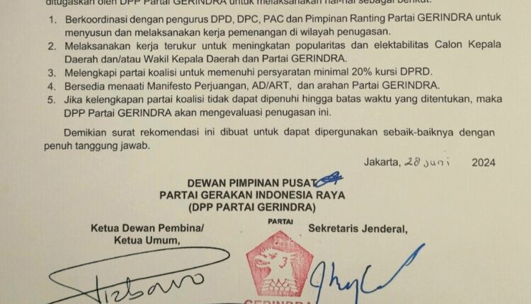 “Dewan Pimpinan Pusat Partai Gerakan Indonesia Raya (DPP Partai GERINDRA) menyetujui dan merekomendasikan Andra Soni sebagai bakal calon Gubernur dan Achmad Dimyati Natakusumah, sebagai bakal calon Wakil Gubernur Provinsi Banten yang ditugaskan oleh DPP Partai GERINDRA,” demikian bunyi surat rekomendasi yang diterbitkan di Jakarta pada Jumat, 28 Juni 2024 lalu ini.