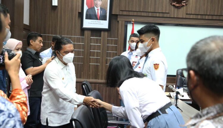 SERANG – Penjabat (Pj) Gubernur Banten Al Muktabar melepas dua pelajar Pasukan Pengibar Bendera Pusaka (Paskibraka) pilihan asal Provinsi Banten, pada Jumat (15/7/2022) di Ruang Rapat Gubernur Banten, KP3B Curug, Kota Serang.