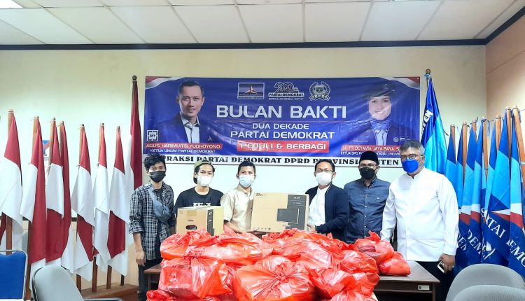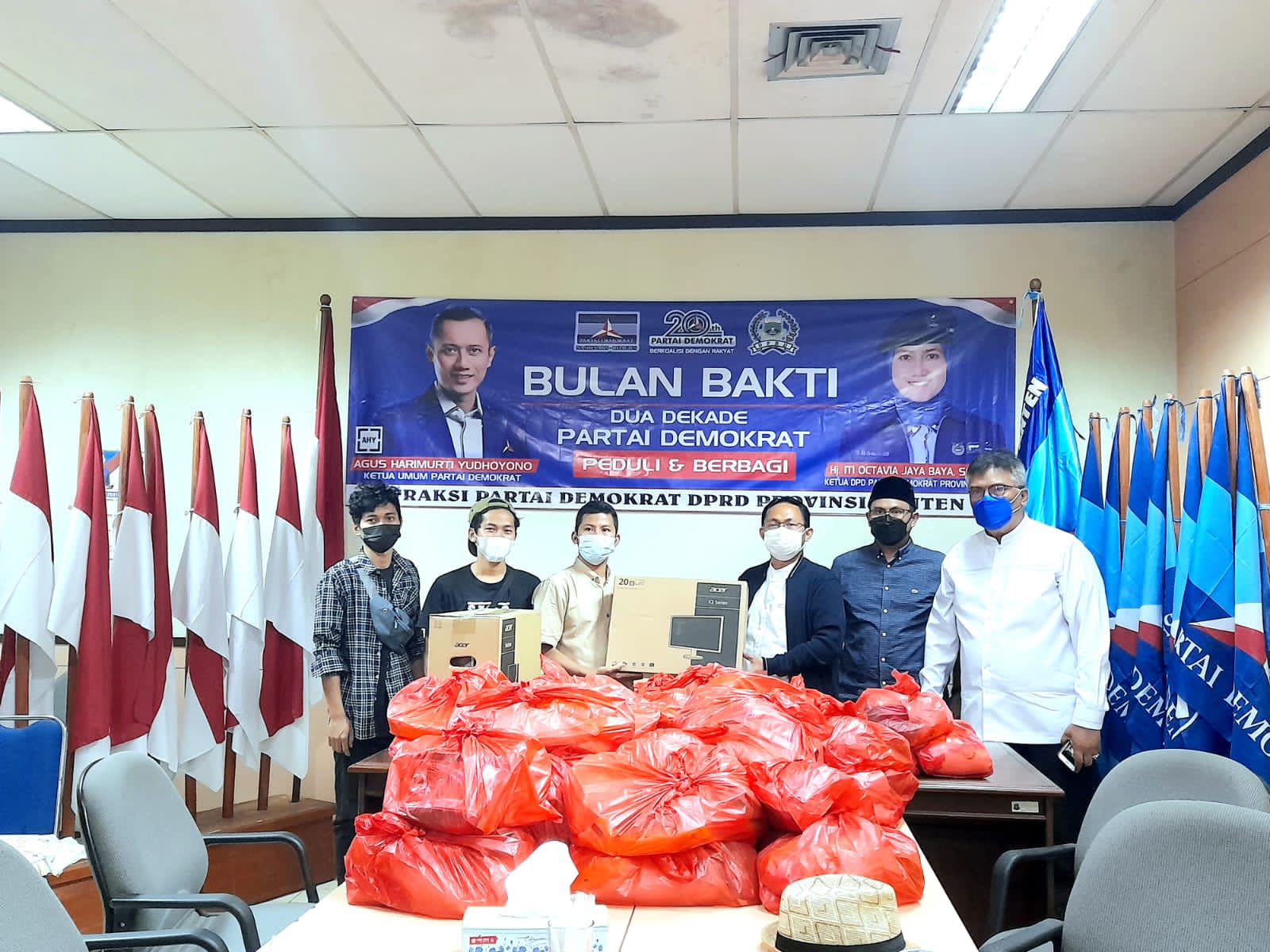 SERANG – Dalam rangka Bulan Bakti dua dekade Partai Demokrat, Fraksi Partai Demokrat Dewan Perwakilan Rakyat Daerah (DPRD) Provinsi Banten berikan bantuan sembako dan komputer kepada Pokja Wartawan Harian dan Ekektronik Provinsi Banten.