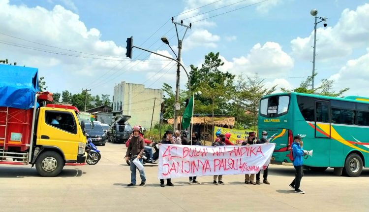 SERANG – Sejumlah mahasiswa yang tergabung dalam Keluarga Mahasiswa Lebak (Kumala) Perwakilan (Pw) Serang menggelar aksi unjuk rasa di Jalan Syekh Moh. Nawawi Albantani, perempatan lampu merah boru, Kecamatan Curug, Kota Serang, Senin (26/10/2020).