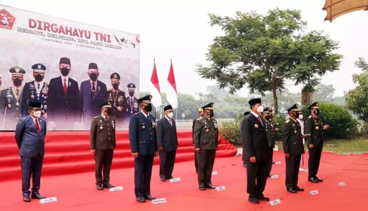 SERANG – Gubernur Banten Wahidin Halim bersama Forum Koordinasi Pimpinan Daerah (Forkopimda) Provinsi Banten mengikuti Upacara HUT TNI ke-76 yang dipimpin Presiden Joko Widodo di Istana Merdeka Jakarta secara virtual dari Lapangan Sekretariat Daerah Provinsi Banten, KP3B Curug, Kota Serang (Selasa, 5/10/2021).