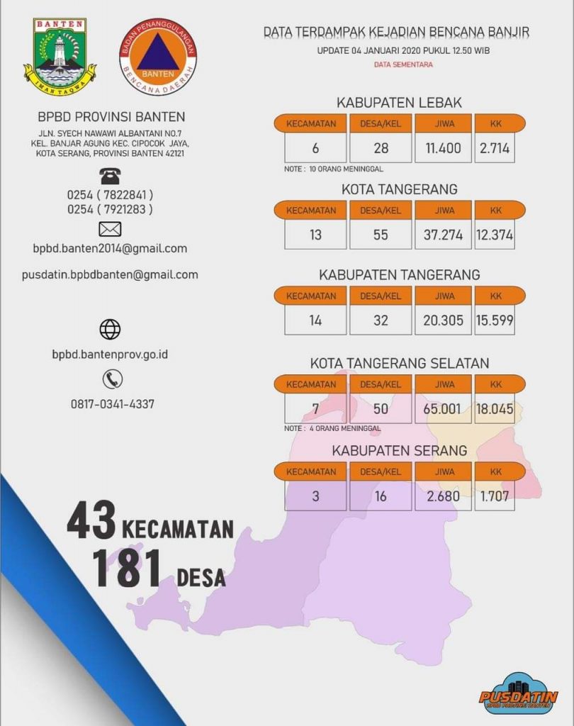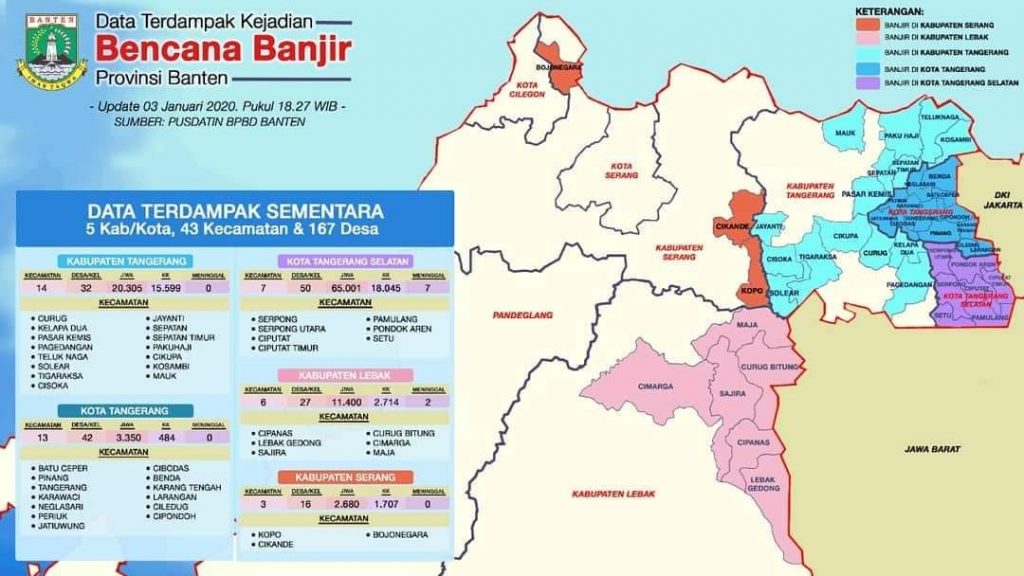 Sebagai informasi banjir yang melanda beberapa wilayah Provinsi Banten berdampak pada 181 desa pada 43 kecamatam di 5 kabupaten/kota. Data terbaru, di beberapa wilayah Kabupetan Lebak telah didirikan 7 posko pengungsianya g menampung 4.365 pengungsi. (*/Red)