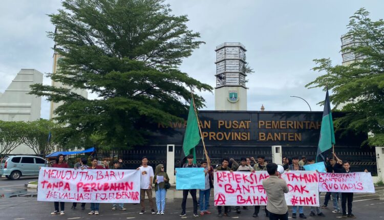 SERANG – Puluhan Mahasiswa yang tergabung dalam Himpunan Mahasiswa Islam (HMI) Cabang Serang gelar aksi Refleksi Akhir Tahun Provinsi Banten di Kawasan Pusat Pemerintahan Provinsi Banten (KP3B), Curug, Kota Serang, Selasa, (27/12/2022).