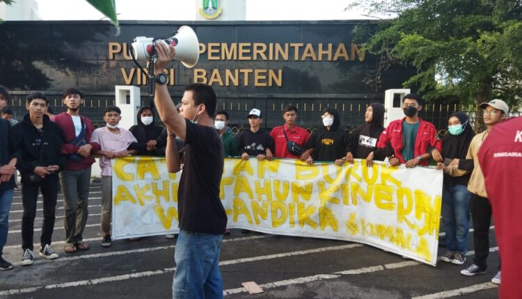SERANG – Puluhan mahasiswa yang tergabung ke dalam Keluarga Mahasiswa Lebak (Kumala) Pw Serang menggelar aksi demonstrasi di depan Kantor Gubernur Banten, Curug, Kota Serang, Jumat, 24 Desember 2021.