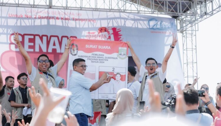 TANGERANG – Relawan Gerakan Bersama 99 menggelar senam sehat bareng calon Gubernur Banten nomor urut 02, Andra Soni di lapangan Pendopo Jameela Village, Jl. Raya Syekh Nawawi Tanara, Kresek, Kabupaten Tangerang, pada Rabu, (23/10/2024). Senam diikuti ribuan warga.