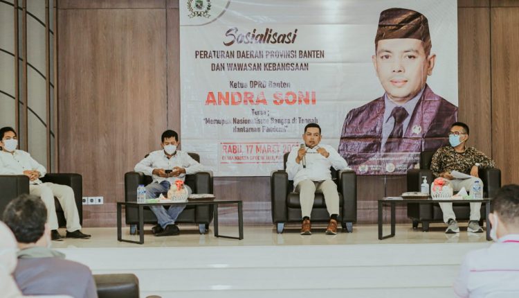 SERANG – Ketua DPRD Banten, Andra Soni kembali melaksanakan sosialisasi peraturan daerah dan wawasan kebangsaan di Graha Mahesa, Kota Serang, Rabu (17/3/2021).
