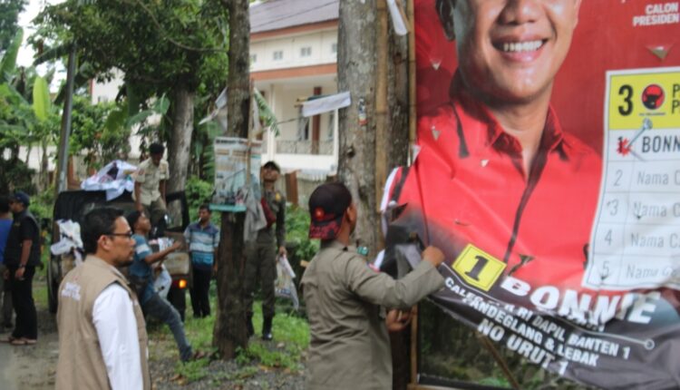 LEBAK – Memasuki masa tenang Pemilu 2024, Bawaslu Banten mulai menurunkan alat peraga kampanye (APK), Minggu, (11/2/2024). Bawaslu Banten menurunkan APK melibatkan seluruh jajaran pengawas Pemilu sampai tingkat kecamatan, kelurahan/desa hingga PTPS.