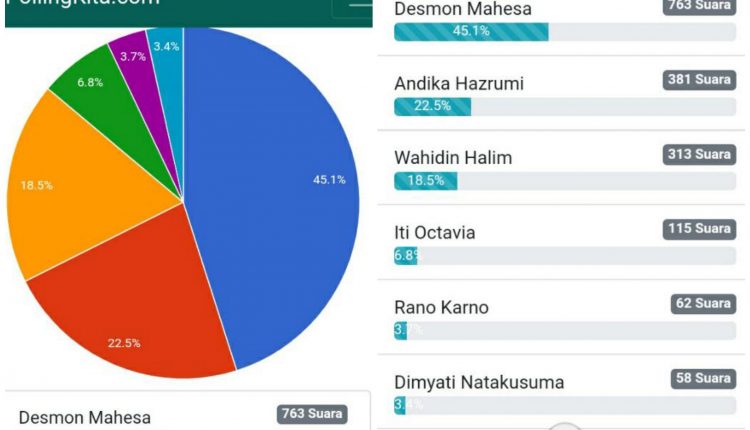 Hasil polling itu memperlihatkan, nama Desmond meraih 45,1% dengan 763 suara, disusul Andika Hazrumy 22,5% dengan 381 suara, kemudian Wahidin Halim 18,5% dengan 313 suara, selanjutnya Iti Octavia 6,8% dengan 115 suara, Rano Karno 3,7% dengan 62 suara, dan terkahir ada Dimyati Natakusuma 3,4% dengan 58 suara. Total sementara 1692 suara di pukul 21:04 pada Senin (31/5/2021).