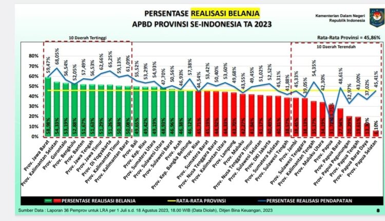 Hal tersebut berdasarkan data yang diolah Direktorat Jenderal (Ditjen) Bina Keuangan Kementerian Dalam Negeri atas Laporan Realisasi Anggaran (LRA) per 1 Juli hingga 18 Agustus 2023 Pukul 18.00 WIB.