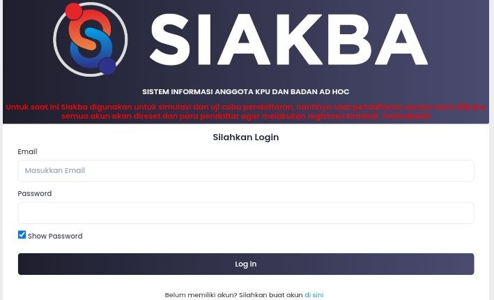 – Akses https://siakba.kpu.go.id , pendaftar membuat akun SIAKBA dengan memasukkan nama, email, NIK, password;