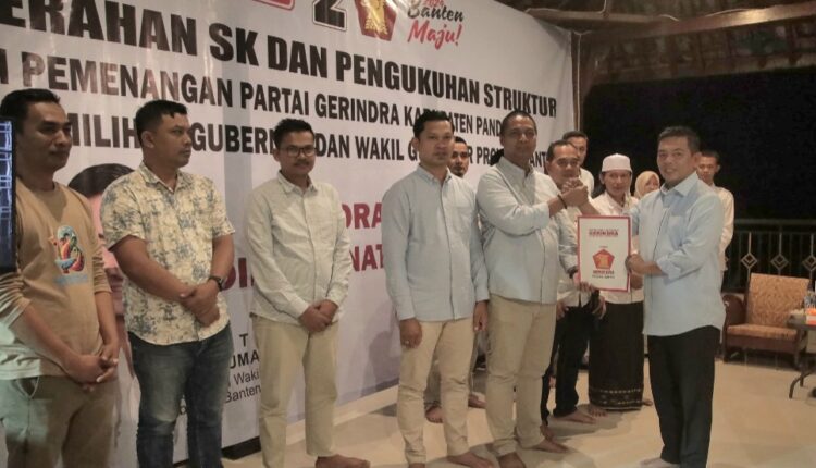 Penyerahan surat keputusan (SK) dan pengukuhan struktur tim pemenangan Partai Gerindra untuk Pilgub Banten 2024 ini sementara telah diberikan kepada dua kabupaten, yakni Lebak dan Pandeglang, pada Sabtu, (6/7/2024). Penyerahan SK langsung diberikan Ketua DPD Partai Gerindra Provinsi Banten Andra Soni.