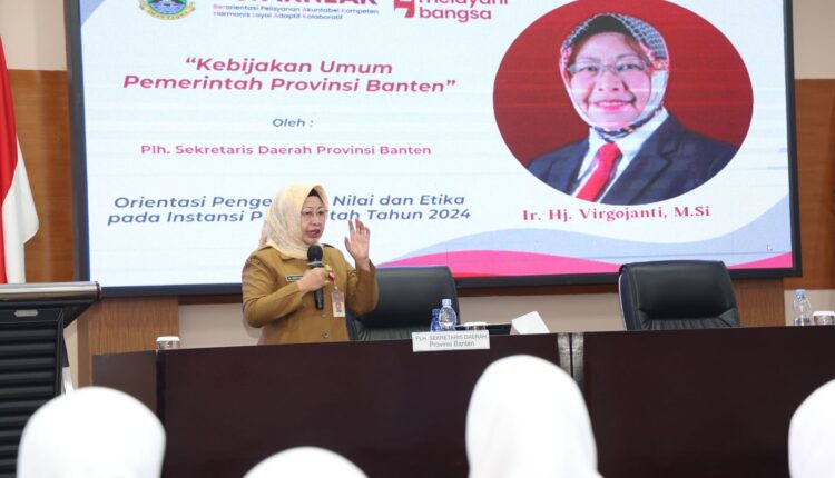 SERANG – Pelaksana Harian Sekretaris Daerah (Plh Sekda) Virgojanti berikan materi terkait Rancangan Pembangunan Daerah (RPD) 2025 kepada para peserta Orientasi Pegawai Pemerintah dengan Perjanjian Kerja (PPPK) Guru di Aula Badan Pengembangan Sumber Daya Manusia Daerah (BPSDMD) Provinsi Banten, Kabupaten Pandeglang, Selasa (28/5/2024).