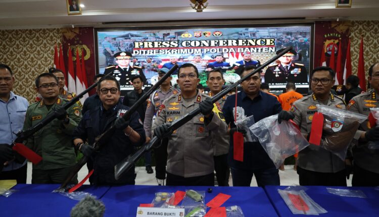 SERANG – Polda Banten gelar press conference ungkap kasus kelanjutan pemburuan liar badak bercula satu di Taman Nasional Ujung Kulon pada Selasa (11/6/2023).