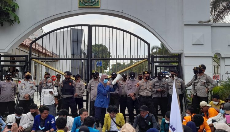 SERANG – Ratusan mahasiswa yang tergabung dalam aliansi BEM Serang Raya menggelar aksi demonstrasi di depan gerbang Kantor Kejaksaan Tinggi (Kejati) Banten, Kota Serang, Rabu (2/6/2021).