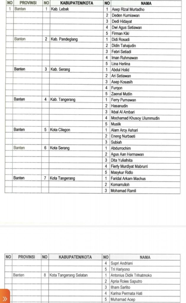 Berdasarkan Nomor:2573.1/KP.01.00/K1/08/2023, Bawaslu RI telah menetapkan nama-nama Anggota Bawaslu kabupaten/kota yang lolos uji kelayakan dan kepatutan. Di antaranya untuk delapan kabupaten/kota Bawaslu se-Provinsi Banten.