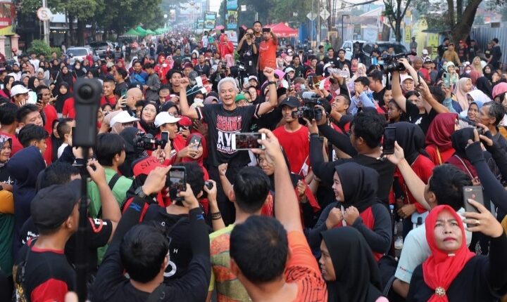Mereka mengikuti arah lari Ganjar dari belakang. Tak ayal teriakan-teriakan dan suara dukungan kepada bacapres berambut putih itu pun menyeruak dari.
