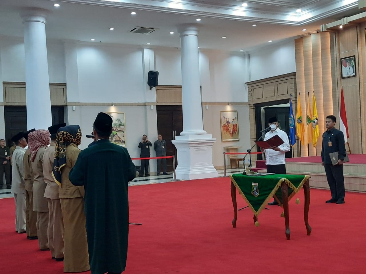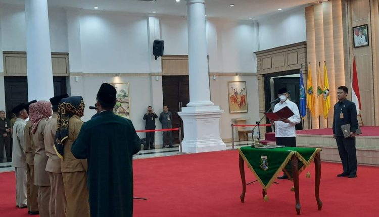 SERANG – Gubernur Banten Wahidim Halim (WH) memakai masker saat melantik 5 (lima) pejabat eselon II Pemerintah Provinsi (Pemprov) Banten, di Pendopo Gubernur Banten, Curug, Kota Serang, Selasa (3/3/2020).