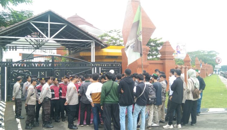SERANG – Sejumlah mahasiswa yang tergabung dalam Himpunan Mahasiswa Islam (HMI) Cabang Serang menggelar aksi saat acara serah terima jabatan (Sertijab) Gubernur dan Wakil Gubernur Banten, Andra Soni dan Dimyati Natakusumah, depan gedung DPRD Provinsi Banten, KP3B, Selasa (4/3/2025) kemarin.