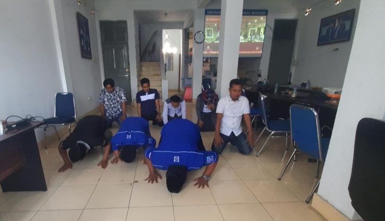 SERANG– Sejumlah kader DPD Partai Demokrat Banten melakukan sujud syukur bersama usai keluar putusan dari Kemenkumham yang membatalkan KLB Partai Demokrat versi Moeldoko pada Rabu (31/3/2021) siang di kantor DPD Partai Demokrat Banten, Kota Serang.