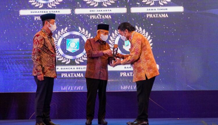 Penghargaan diberikan oleh Wakil Presiden RI KH Ma’ruf Amin kepada Penjabat (Pj) Gubernur Banten Al Muktabar di Ballroom Hotel Indonesia Kempinski, Jakarta, Kamis (16/2/2023). Banten merupakan satu dari 11 Provinsi yang mendapatkan penghargaan dari KPPU.