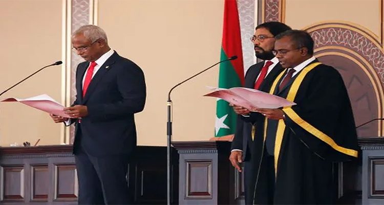 Perdana Menteri India Narendra Modi, yang berusaha untuk merebut kembali negara itu sebagai bagian dari wilayah pengaruhnya, adalah pengunjung asing peringkat tertinggi pada upacara pelantikan yang diadakan di sebuah stadion sepak bola di Ibu Kota Maladewa, Male.
