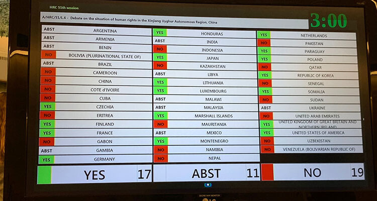 Dalam foto itu disebutkan 17 negara menyatakan “Yes” untuk membahas pelanggaran HAM terhadap Uighur. Sementara ada 11 negara “abstain”, dan 19 negara menyatakan “No”.
