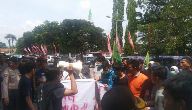 LEBAK – Puluhan mahasiswa yang tergabung dalam Keluarga Mahasiswa Lebak (Kumala) menggelar aksi unjuk rasa di depan pintu Pendopo Pemda Lebak. Aksi tersebut digelar dalam rangka Hari Ulang Tahun (HUT) Kabupaten Lebak yang ke-191, Senin (2/12/2019).