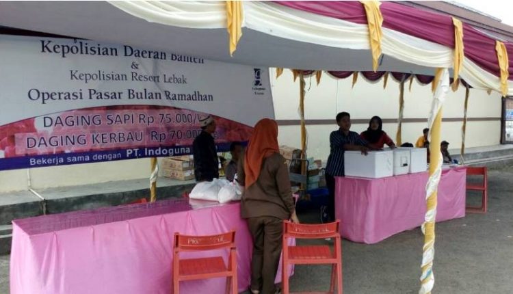 LEBAK – Guna mengantisipasi terjadinya lonjakan harga daging di pasaran, Polda Banten bersama Polres Lebak yang bekerjasama dengan PT Indoguna Utama menggelar operasi pasar daging di Markas Polsek Kota Rangkasbitung.