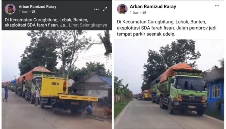 “Di Kecamatan Curugbitung, Lebak, Banten eksploitasi SDA farah fisan (parah banget, red). Jalan pemprov jadi tempat parkir seenak udele,” tulisnya, Minggu (18/4/2021).