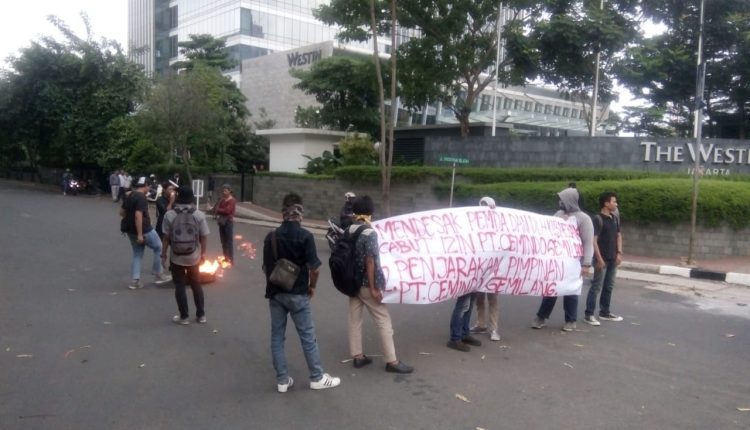 JAKARTA – Puluhan mahasiswa kembali melakukan aksi demonstrasi di depan kantor pusat PT Cemindo Gemilang Jalan Rasuna Said, Kuningan, Jakarta Selatan.