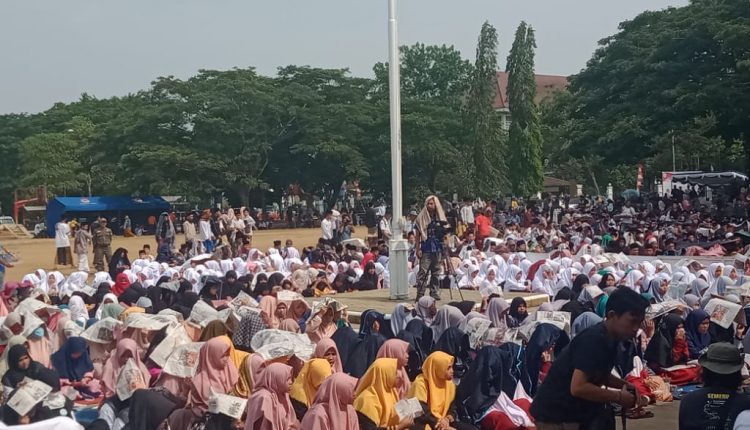 LEBAK – Ribuan santri yang berasal dari berbagai Pondok Pesantren (Ponpes) di Kabupaten Lebak menggelar istighosah bersama di Alun-alun Rangkasbitung, Senin (21/10/2019). Dalam istighosah tersebut, para santri mendoakan keutuhan Negara Kesatuan Republik Indonesia (NKRI).