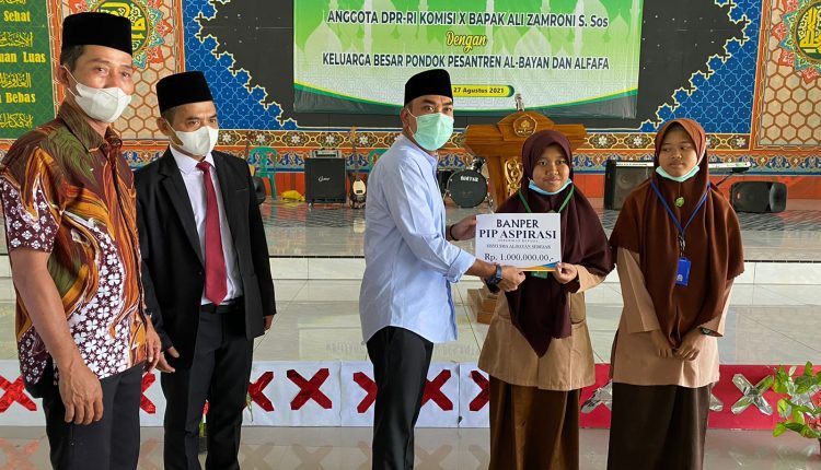 LEBAK – Anggota DPR RI dari Fraksi Partai Gerindra, Ali Zamroni, menyerahkan bantuan Beasiswa dari Program Indonesia Pintar (PIP) kepada ratusan siswa-siswi di Pondok Pesantren Al-Fafa dan Al-Bayan yang berlokasi di Desa Nameng, Kecamatan Rangkasbitung, Kabupaten Lebak, pada Jumat (27/8/2021).