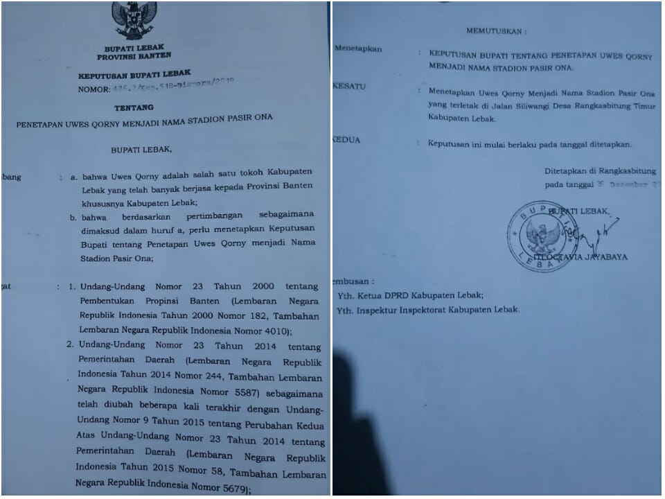 LEBAK – Menyusul terbitnya keputusan Bupati Lebak Iti Octavia Jayabaya Nomor: 426.2/Kep.518-Dispora/2019, Pemerintah Kabupaten Lebak resmi mengganti nama Stadion Pasir Ona menjadi Stadion Uwes Qorny.