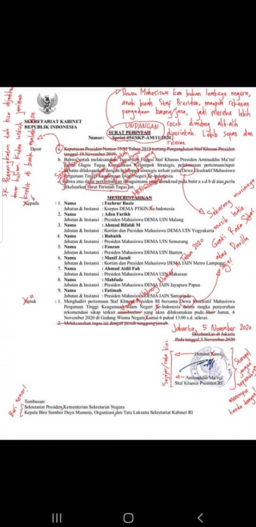 Dia juga menyesalkan adanya kesalahan penulisan/salah ketik dan penggunaan dasar hukum yang kurang tepat dalam surat perintah tersebut yang berpotensi maladministrasi. Dalam surat perintah yang diperuntukkan untuk mahasiswa, Aminuddin menyertakan Keputusan Presiden Nomor 75/M Tahun 2019 tentang Pengangkatan Staf Khusus Presiden.