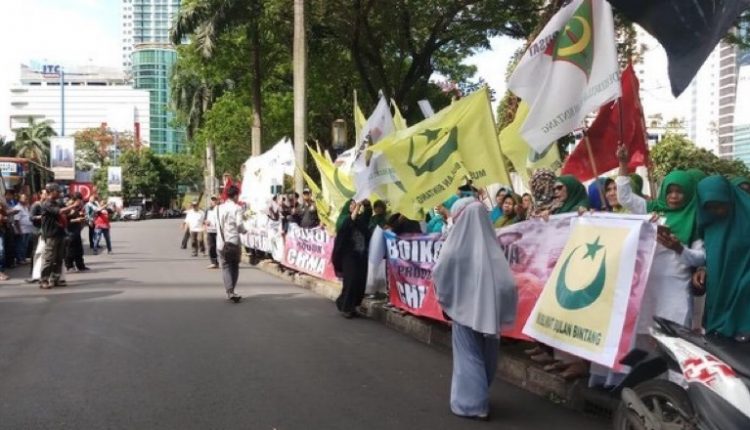 JAKARTA – Massa dari Pemuda dan Muslimat Bulan Bintang yang masih bagian dari Partai Bulan Bintang (PBB) menggelar aksi di depan Kedutaan Besar China di Jakarta. Aksi dalam rangka solidaritas terhadap muslim Uighur di China yang mengalami diskriminasi.