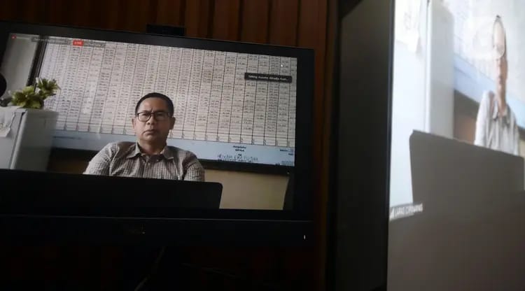 Terdakwa Tubagus Chaeri Wardana alias Wawan mendengarkan Jaksa Penutut Umum (JPU) membacakan tuntutan dalam sidang online di Gedung KPK, Jakarta, Senin (29/6/2020). Wawan terjerat tindak pidana pencucian uang (TPPU) dalam kasus sejumlah korupsi.