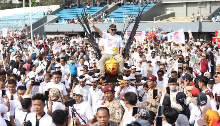 LAMPUNG – Sekjen Partai Gerindra Ahmad Muzani menghadiri acara jalan sehat dan pesta rakyat yang digelar oleh DPD Gerindra Lampung, di Stadion Pahoman, Minggu (5/3/2023).