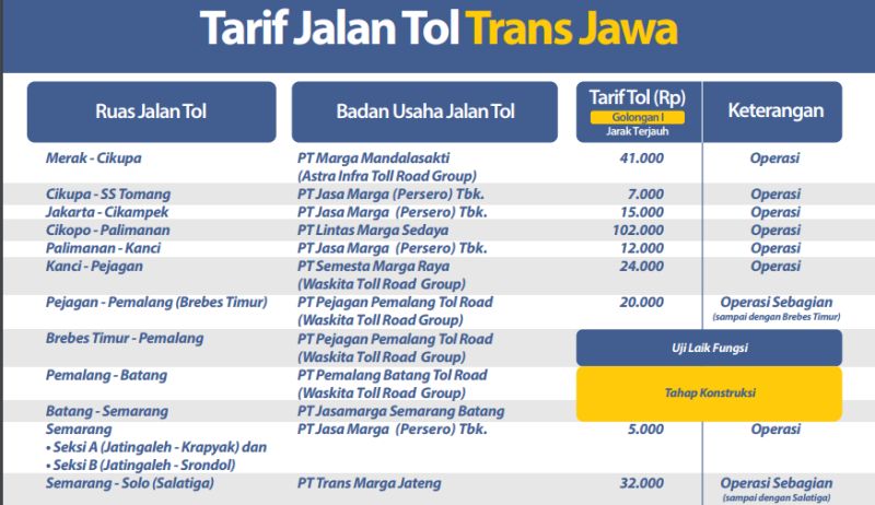 Perhitungan tarif tol Trans Jawa tersebut berdasarkan tarif ruas jalan tol yang telah beroperasi dan dikelola oleh Jasa Marga dan kelompok usahanya, serta informasi dari Badan Usaha Jalan Tol (BUJT) lainnya. Sedangkan beberapa ruas jalan tol yang masih dalam tahap uji laik fungsi atau masih dalam tahap konstruksi, belum ditetapkan besaran tarifnya.