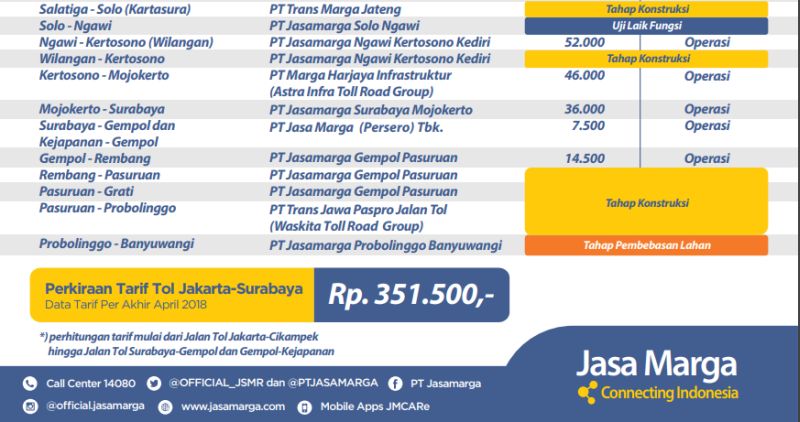 JAKARTA – PT Jasa Marga Tbk (JSMR) menegaskan, berdasarkan data tarif tol per akhir bulan April 2018, tarif tol Trans Jawa, untuk ruas dari Jakarta hingga Surabaya, adalah Rp 351.500. Perhitungan tarif tersebut mulai dari Jalan Tol Jakarta-Cikampek hingga Jalan Tol Surabaya-Gempol dan Kejapanan-Gempol.