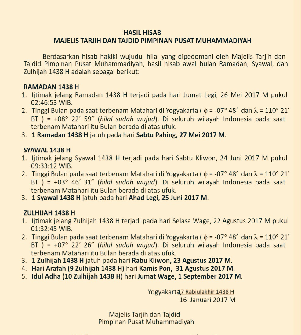 Maklumat Pimpinan Pusat Muhammadiyah itu bernomor 01/MLM/I.0/E/2017 ditandatangani Ketua Umum Pimpinan Pusat Muhammadiyah Haedar Nashir, dan Sekretaris Umum Abdul Muti. Berdasar penghitungan hisab yang dilakukan Pimpinan Pusat Muhammadiyah, Ijtimak jelang Dzulhijjah 1438 H terjadi pada Selasa, 22 Agustus 2O17. Kemudian hari Arafah 9 Zulhijah 1438 H di hari Kamis, 31 Agustus 2O17.