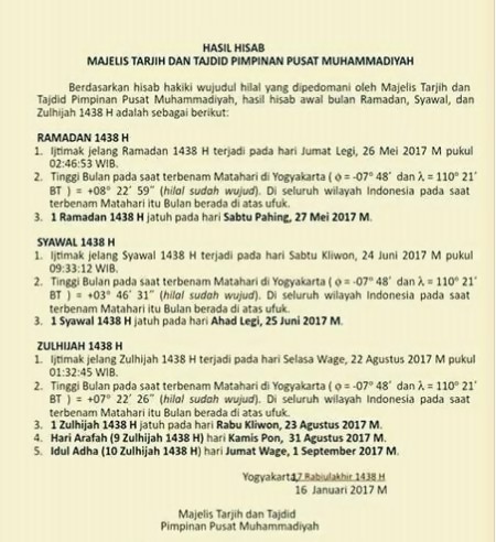 “1 Ramadan 1438 H jatuh pada Sabtu Pahing, 27 Mei 2017,” bunyi maklumat yang tersebar di media sosial.
