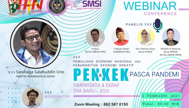 JAKARTA – Dalam rangka memperingati Hari Pers Nasional (HPN) yang jatuh pada 09 Februari 2021, Serikat Media Siber Indonesia (SMSI) menggelar beberapa rangkaian kegiatan salah satunya seminar Nasional yang digelar secara virtual pada 03 Februari 2021 mendatang dengan mengusung tema “Pemulihan Ekonomi Nasional dan Kebangkitan Ekonomi Kreatif (PENKEK Pasca Pandemi)”.