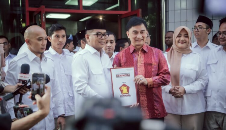 JAKARTA – DPP Partai Gerindra menyerahkan formulir B-1 KWK kepada pasangan bakal calon Gubernur dan Wakil Gubernur Banten Andra Soni-Dimyati Natakusumah, di Kantor DPP Partai Gerindra, Jalan Harsono RM Nomor 54 Ragunan Pasar Minggu, Jakarta Selatan, pada Jumat, (23/8/2024).