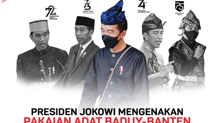 Jokowi tampak mengenakan pakaian adat suku Baduy yakni pakaian hitam lengkap dengan penutup kepala berwarna biru.