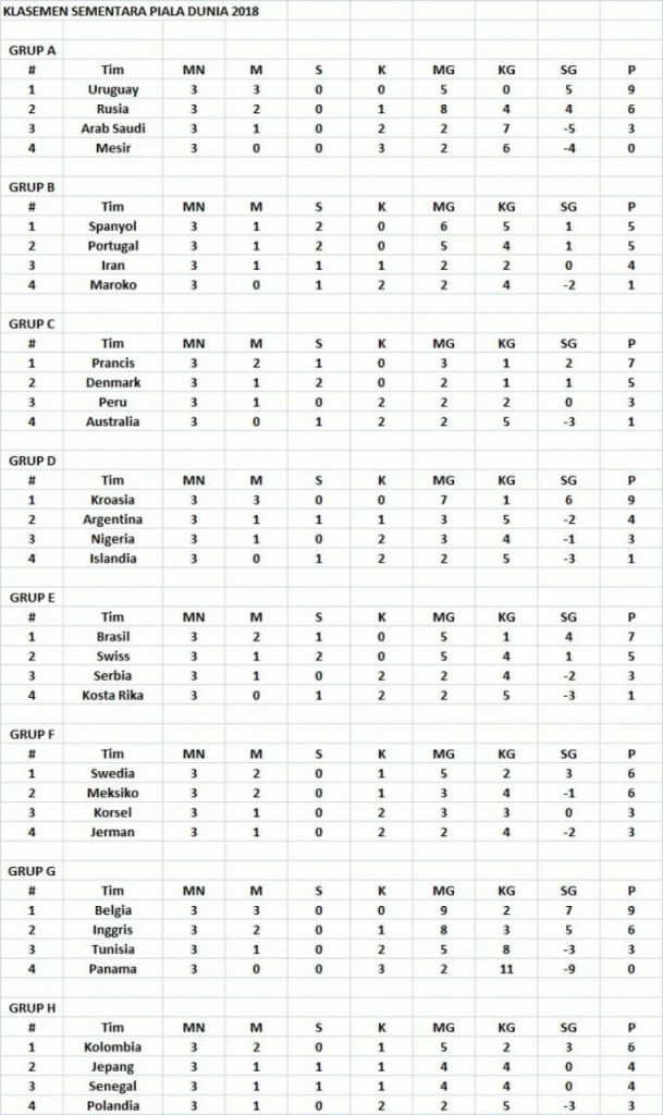 Ini Hasil dan Klasemen Akhir Penyisihan Grup Piala Dunia 2018