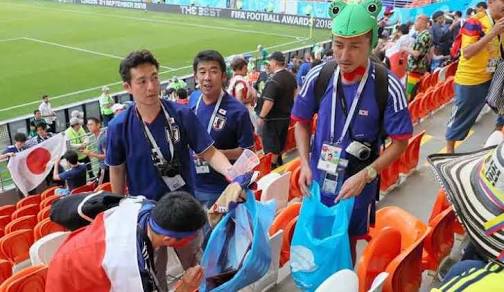 Meski mengalami kekalahan, tindakan supporter Jepang ini sangat patut dicontoh. Setelah pertandingan, mereka tak langsung meninggalkan lapangan. Membersihkan sampah menjadi kegiatan rutin yang dilakukan pasca pertandingan.