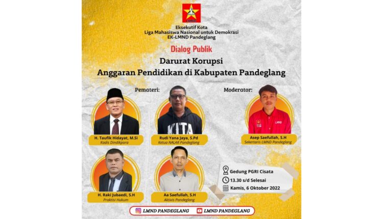 PANDEGLANG – Eksekutif Kota Liga mahasiswa Nasional untuk Demokrasi (EK-LMND) Pandeglang akan gelar dialog publik dengan tema “Darurat Korupsi Anggaran Pendidikan di Kabupaten Pandeglang”